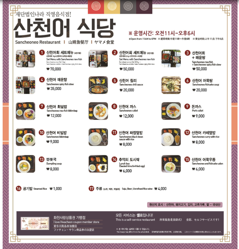 | 운영 내용 | 산천어를 이용한 구이, 회, 가스, 정식, 어묵탕, 어묵 등 판매 |